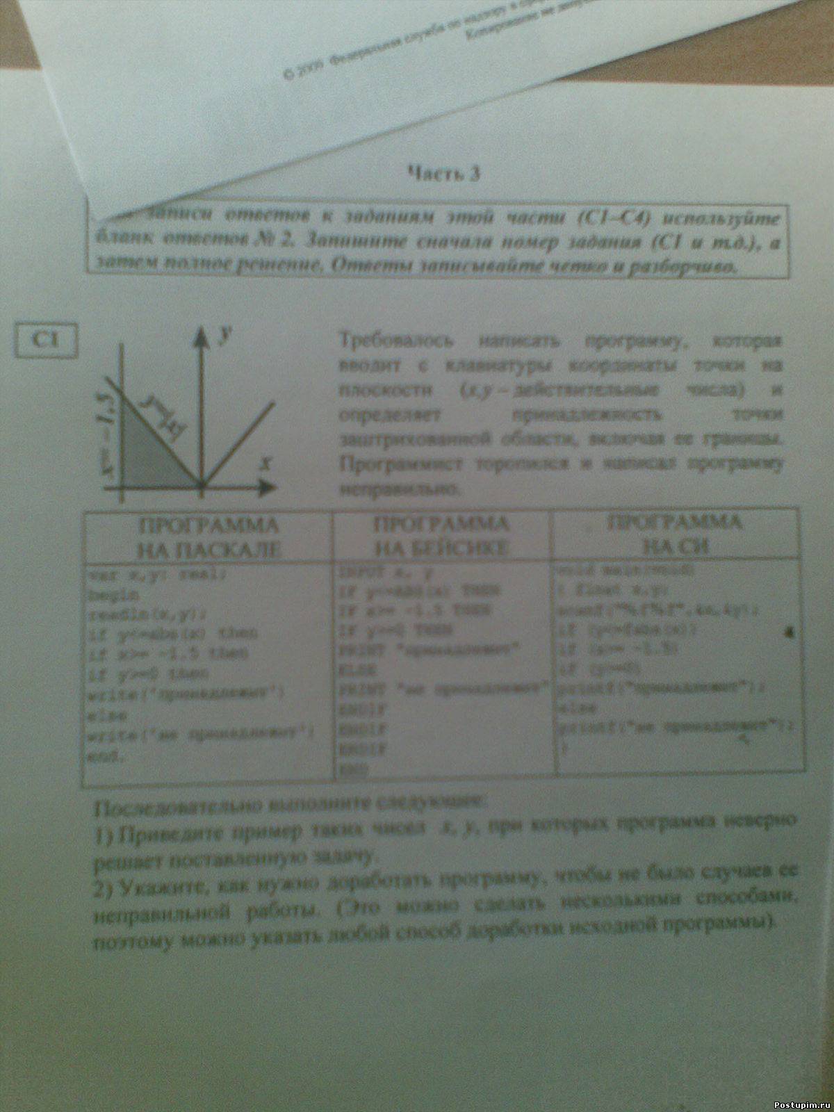 | C1 и C2 ---- Пишу задание и решение к нему. C1 Требовалось написать программу, которая вводит с клавиатуры координаты точек на плоскости (х,у - дествительные числа) и определяет принадлежность точки заштрихованной области, входит её границы. Решение-исправление [проверено на паскале] Code var x, y:real; begin readln(x,y); if y <= abs(x) then begin if x >= -1.5 then if y >= 0 then write('принадлежит'); end else write('не принадлежит'); end. С2 Дан целочисленный массив из 30 элементов. Элементы массива могут принимать значения из от 0 до 100 - баллы учащихся выпускного класса за итоговый тест по информатике. Опишите на русском языке или на одном из языков программирования алгоритм, который подсчитывает и выводит средний балл среди учащихся, получиших за тест пложительную оценку (для получения положительной оценки требовалось набрать более 20 баллов). Гарантируется, что в классе хотя бы один учащийся получил за тест положительную оценку. Решение: Code uses crt; const N=30; var a:array [1..n] of integer; i,x ,y: integer; s: real; begin for i:=1 to N do readln(a[i]); s:=0; y:=0; for i:=1 to N do if a[i] >= 20 then {проверка на то что оценка положительная} begin {если да} s:=s+a[i]; {находим суммарный балл} y:=y+1; end; writeln(s/y); end. Всё решение предоставил Wlad, за что ему большое спасибо.