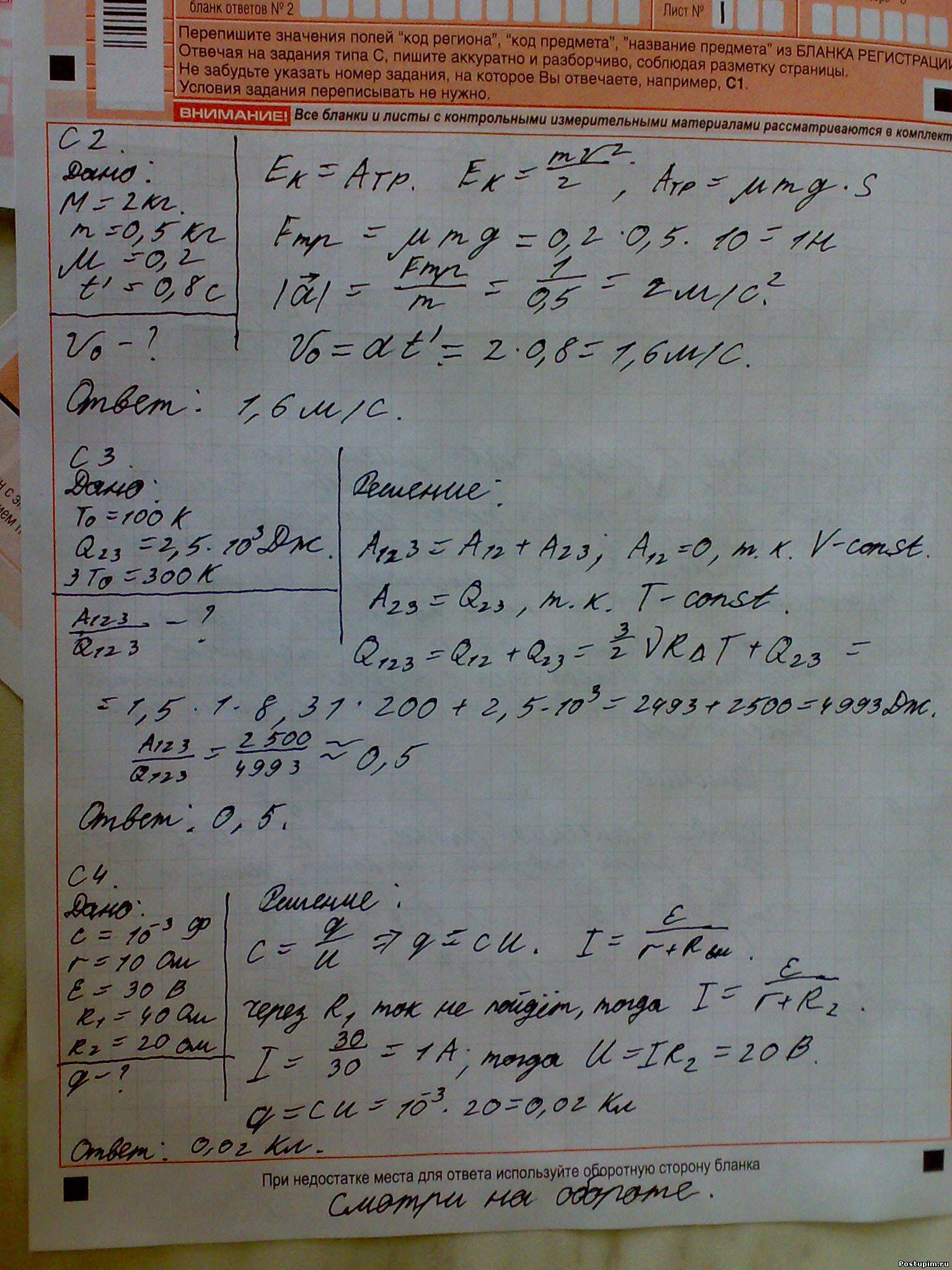 | XxXKirillXxX, http://forum.postupim.ru/forum/29-4173-2.лови Добавлено (2009-06-17, 10:09 Am) --------------------------------------------- а вот решение Nemiroffa: Значит так. F' - сила трения M, m - массы доски и шайбы u - коэф. трения v - скорость, с которой двигается доска, когда шайба на доске неподвижна v0 - нач. скорость шайбы a1, a2 - ускорения шайбы и доски Шайба замедляется под действием силы трения, поэтому ma1=F'=umg => a1=ug По третьему закону Ньютона на доску со стороны действует сила, равная силе трения по модулю и противоположная по направлению. Под действием этой силы доска ускоряется. Ma2 = F' Приравниваем: Ma2=ma1 Теперь ускорения (в проекциях): -a1=(v-v0)/t a2=v/t Получаем два уравнения: (v0-v)/t=ug mug=Mv/t Выражаем в одном v и подставляем в другое. Получаем конечное уравнение: v0M - tmug = tMug Из него уже выражается что угодно. Добавлено (2009-06-17, 10:10 Am) --------------------------------------------- Nemiroff, загляни в соседнюю тему(очень хочется узнать твое мнение). Добавлено (2009-06-17, 10:14 Am) --------------------------------------------- я всетаки думаю аппеляция рулит:некорректное довольно таки условие,вседствии чего доска может двигаться в умах одних,и покоиться в умах других.согласны? Добавлено (2009-06-17, 10:16 Am) --------------------------------------------- XxXKirillXxX, задания у нас одинаковые замечу.во втором ответ такой же,да и собственно решение тоже. Добавлено (2009-06-17, 10:18 Am) --------------------------------------------- XxXKirillXxX, жжошь однозначно:это ты так паржать на экзамене пыталсо:"смотри на обороте"?гыгыгы что интересно рядом с надписью того же смысла,и за полями,которые не увидят проверяющие.