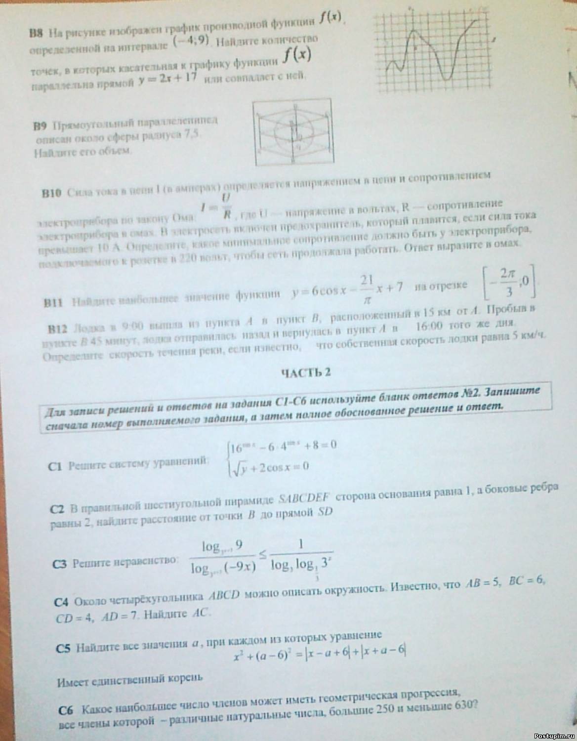 | Quote (apotigma) вам дали прошлогодние распечатки) в этом году в С1 будет ОДНО тригонометрическое уравнение. а в С5 - Система уравнений с параметром. а тут - всё как в 2010 А ты не мог бы выложить ответы на этот вариант или ссылку???