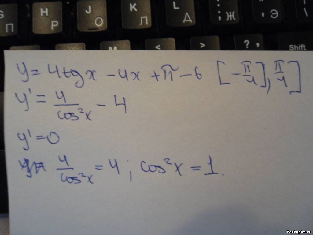| 1)y'= 4/cos^2(x)-4=4tg^2(x) - возрастает Если надо найти наименьшее значение то берешь (-п/4), если наибольшее - (п/4). Подставляешь в самую первую формулу и готово.