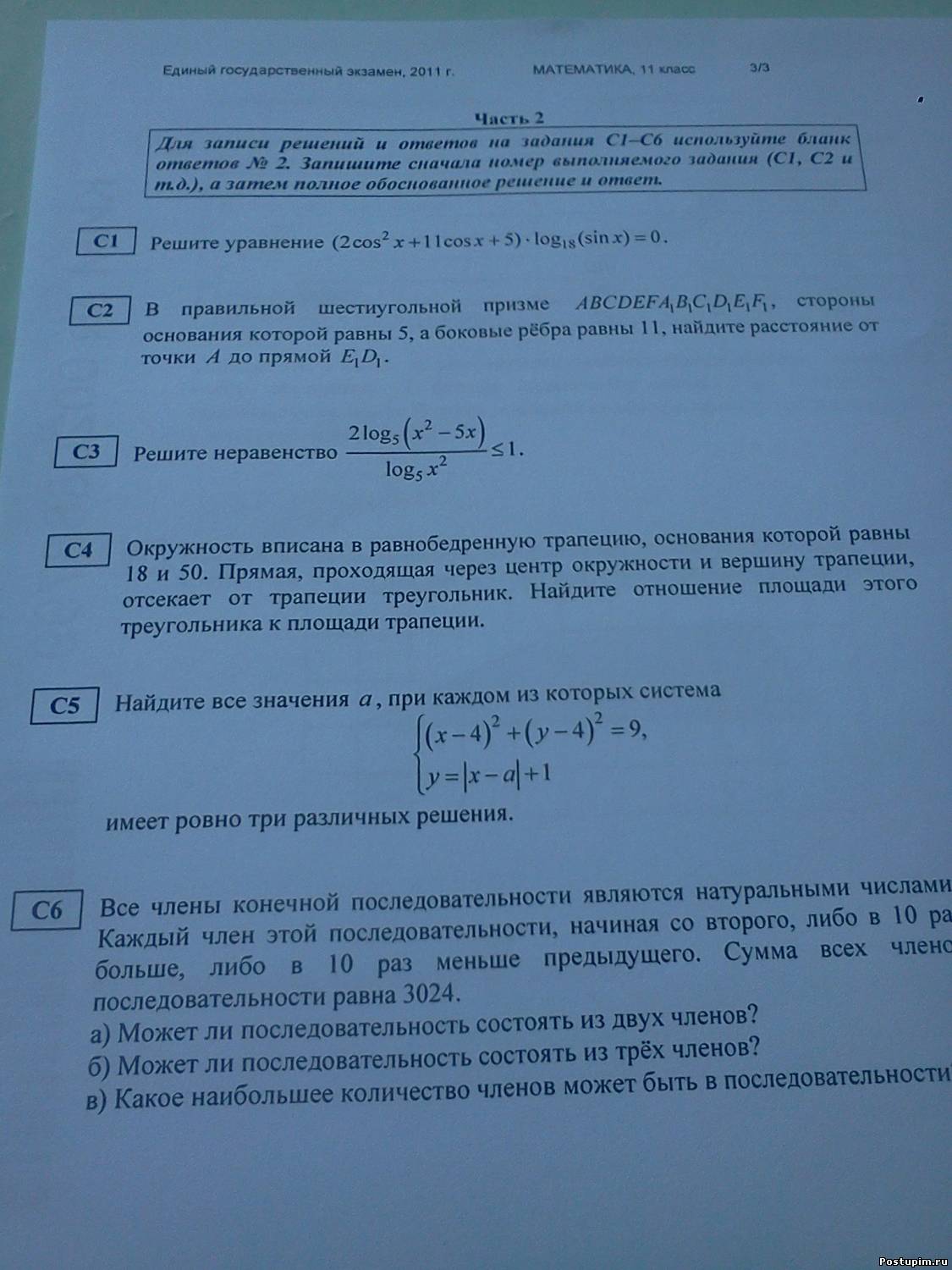 Ответ: а) нет ; б) да:10*144; 144;10*144 в) 549Добавлено (2011-06-06, 8:28 Am) --------------------------------------------- С3. 2*log_5 (x^2 - 5x) / log_5 x^2 <= 1 ОДЗ: x^2 - 5x>0 x(x-5)>0 (-беск; 0) и (5; + беск) x^2>0 x не равно 0 log_5 x^2 не равно 0; x^2 не равно 1 ; x не равно +/- 1
