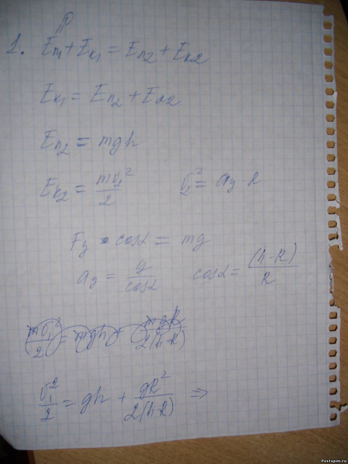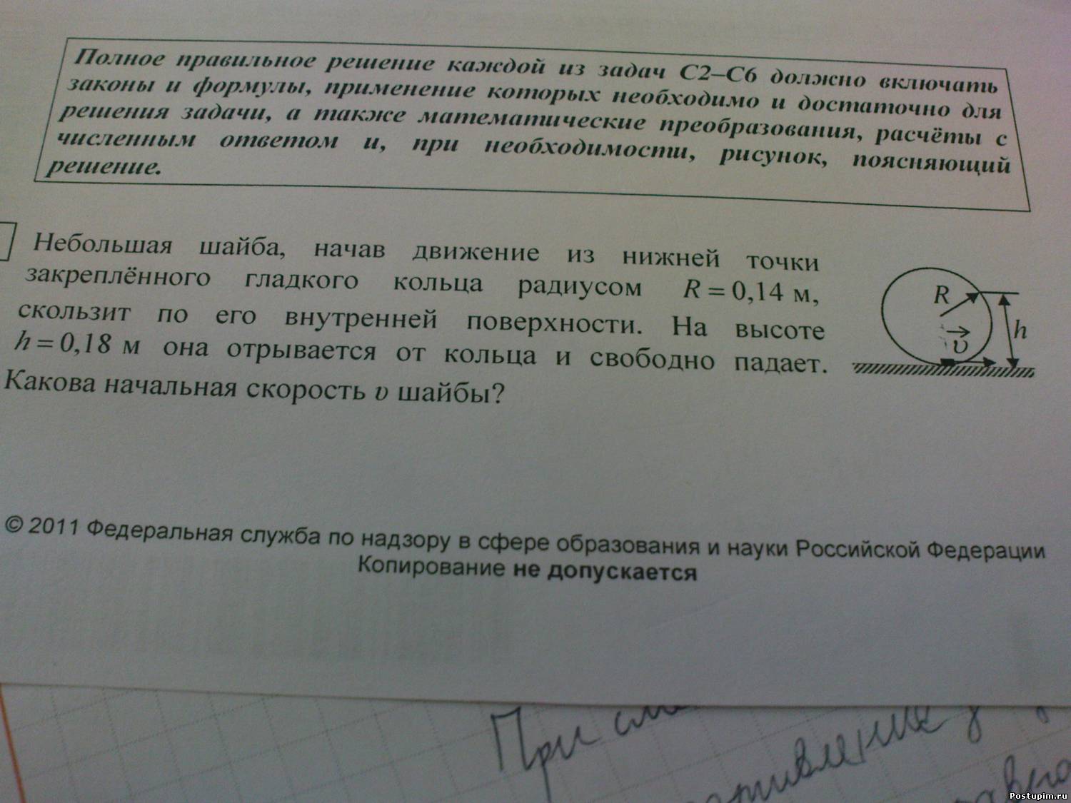 | С2 Помогите пожалуйста Небольшая шайба массой m=10 г, начав движение из нижней точки закрепленного гладкого кольца радиусом R=0.14м, скользит по его внутренней поверхности. На высоте h=0.18м она отрывается от кольца и свободно падает. Какую кинетическую энергию имела шайба в начале движения?