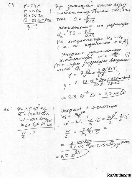 | у тебя ни С4, ни С6 не правильно, сейчас сделаю их Добавлено (2011-06-14, 8:18 Am) --------------------------------------------- C4: r=5 R=25 ЭДС=24 Находим I=ЭДС/r+R=24/30=0.8 Далее находим U=IR= 0.8*25=20 Далее ищем t, т.к q=It Q=I^2Rt =} t=Q/I^2R=20*10^-6/0.64*25=1.25*10^-6 q=0.8*1.25*10^-6=1*10^-6=10^-6