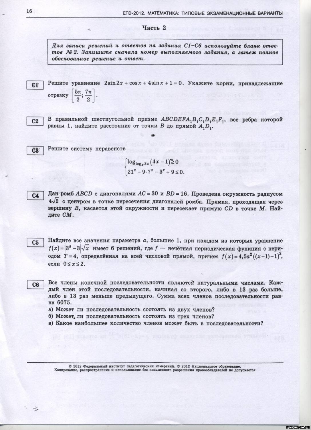 | Варианты из книжки ЕГЭ-2012 типовые экзаменационные варианты Под редакцией А.Л.Семенова,И.В.Ященко ,скачай в ней есть ответы