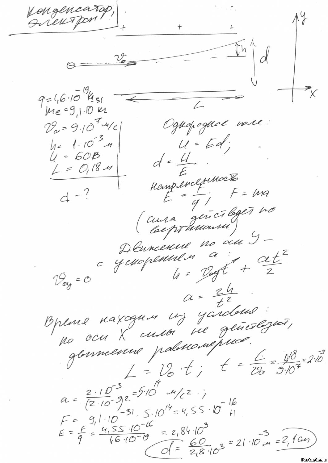| Запишу основные формулы, остальное, думаю сам поймешь. Электрон двигается в горизонтальном направлении с начальной скоростью. Время движения: t=L/Vo за это время в вертикальном направлении он смещается на: h=a*t^2/2 движение равноускоренное с нулевой начальной скоростью. 2 закон Ньютона: ma=F; ma=eE; Ускорение a=eE/m заряд и масса электрона величины табличные. Напряженность связана с напряжением: E=U/d Остальное дело техники
