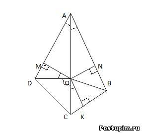 | Помогите решить задачу по геометрии. Очень срочно надо. Точка О лежит на диагонали АС выпуклого четырёхугольника ABCD. Известно, что ОС=ОD и что точка О одинаково удалена от сторон AD, AB и ВC, угол AOB = 110 град., угол COD - прямой. Найти углы четырёхугольника ABCD.