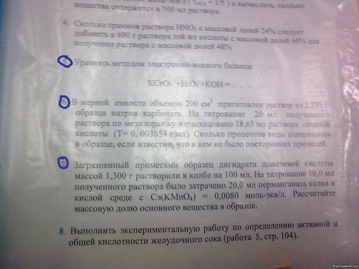 Всем привет))) Помогите мне решить задачи по химии, а то завтра контрольная, я ничего не понимаю... 1) Определить титр перманганата калия с молярной концентрацией эквивалента 0,1000 моль-экв./л (фактор эквивалентности равен 1/5) и вычислить сколько вещества содержится в 500 мл раствора. 2) Сколько граммов раствора HNO3 с массовой долей 24% следует добавить к 600 г раствора той же кислоты с массовой долей 60% для получения раствора с массовой долей 48% ну и вот тут немного... пожалуйста....я рассчитываю на вас)))