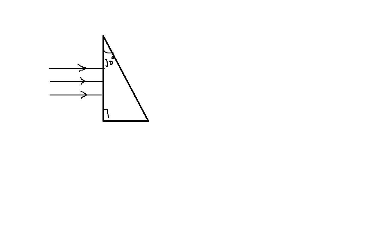 | FKL, сделай сначала чертеж. ЛУч, падающий на призму должен преломиться дважды. В точке, где он переходит из воздуха в стекло и в точке перехода из стекла в воздух. В данном случае угол падения в первой точке О, поэтому там луч не меняет направление. Во второй точке угол увеличивается. На выходе из призмы получается параллельный пучок, но уже другой толщины.